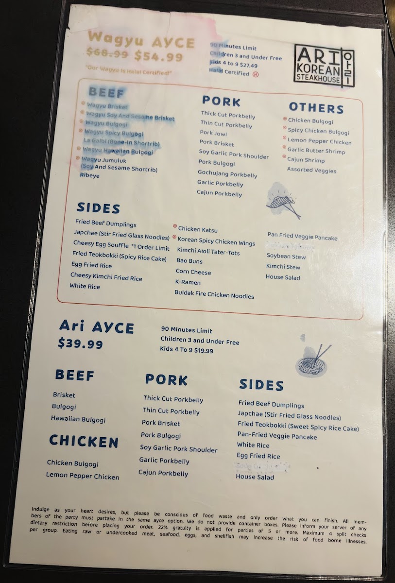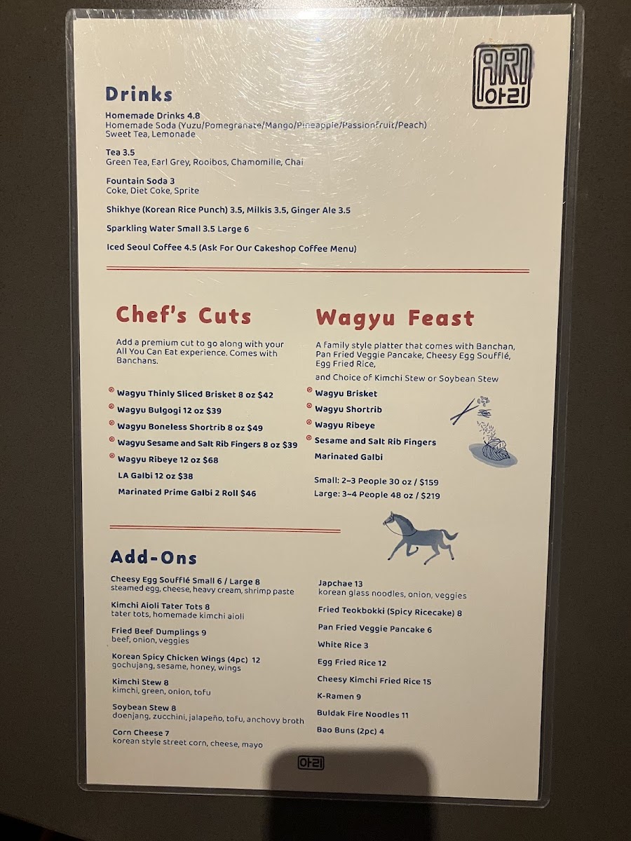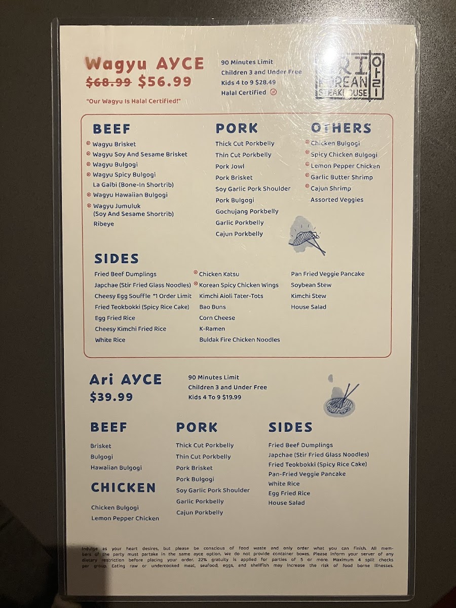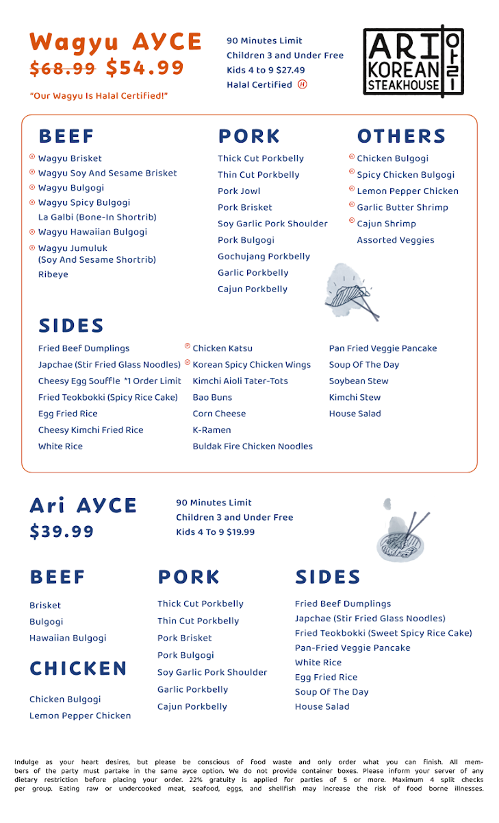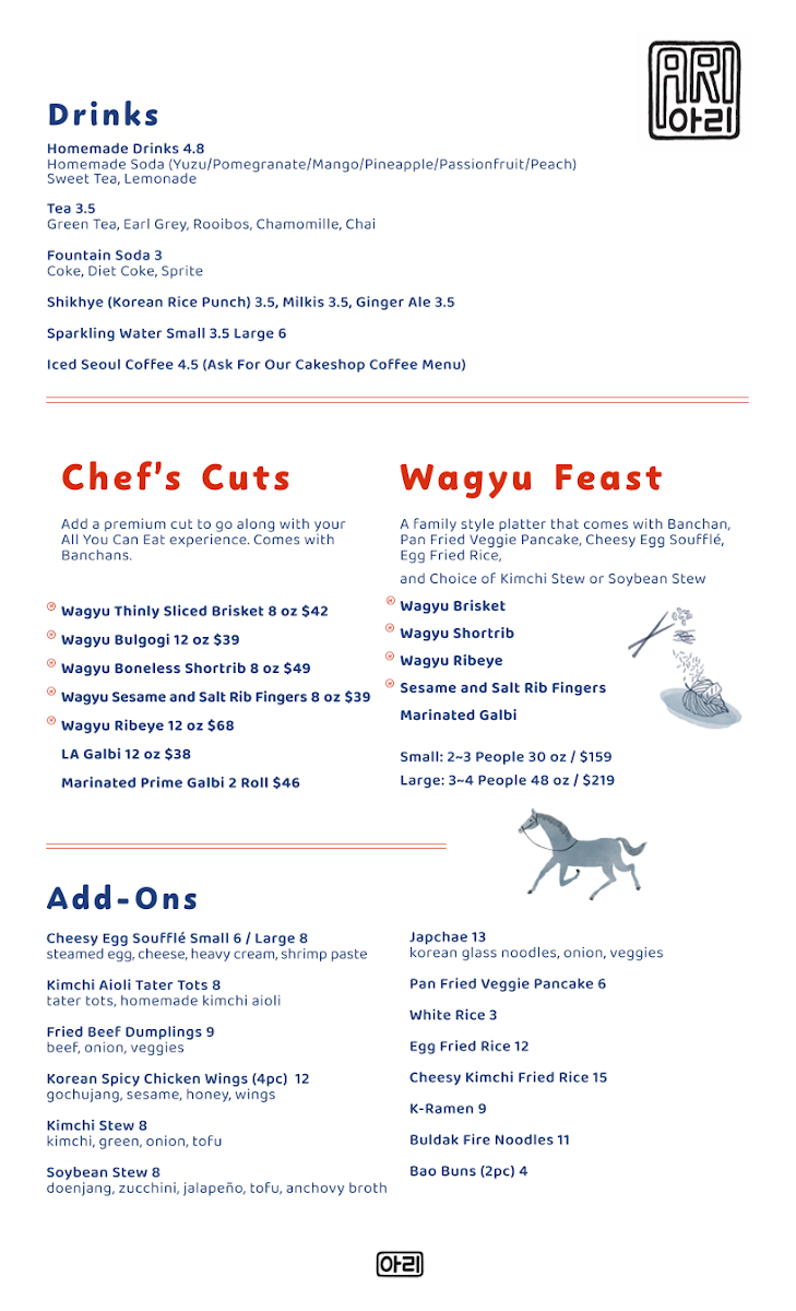 At Ari Korean BBQ & The Cakeshop Menu, you'll experience a delightful blend of authentic Korean BBQ and irresistible cakes, perfect for any occasion. Located in the heart of Johns Creek, Georgia, this spot offers a cozy atmosphere where you can enjoy grilling your own meats right at your table, creating a truly interactive dining experience. Whether you’re in the mood for perfectly seasoned beef, pork, or chicken, the menu delivers a variety of options that cater to all tastes. And don’t forget to leave room for dessert - the Cakeshop features a tempting selection of freshly baked treats that range from decadent cakes to delightful pastries. With a menu that pairs savory and sweet seamlessly, Ari Korean BBQ & The Cakeshop ensures a satisfying meal every time you visit.