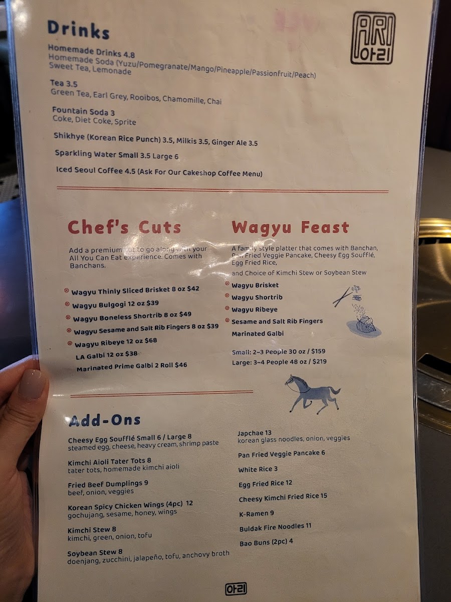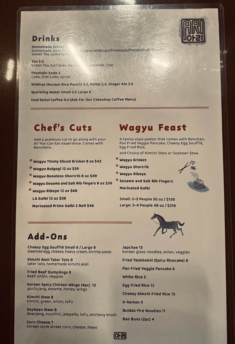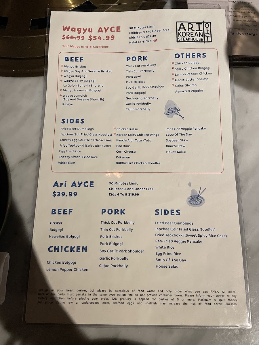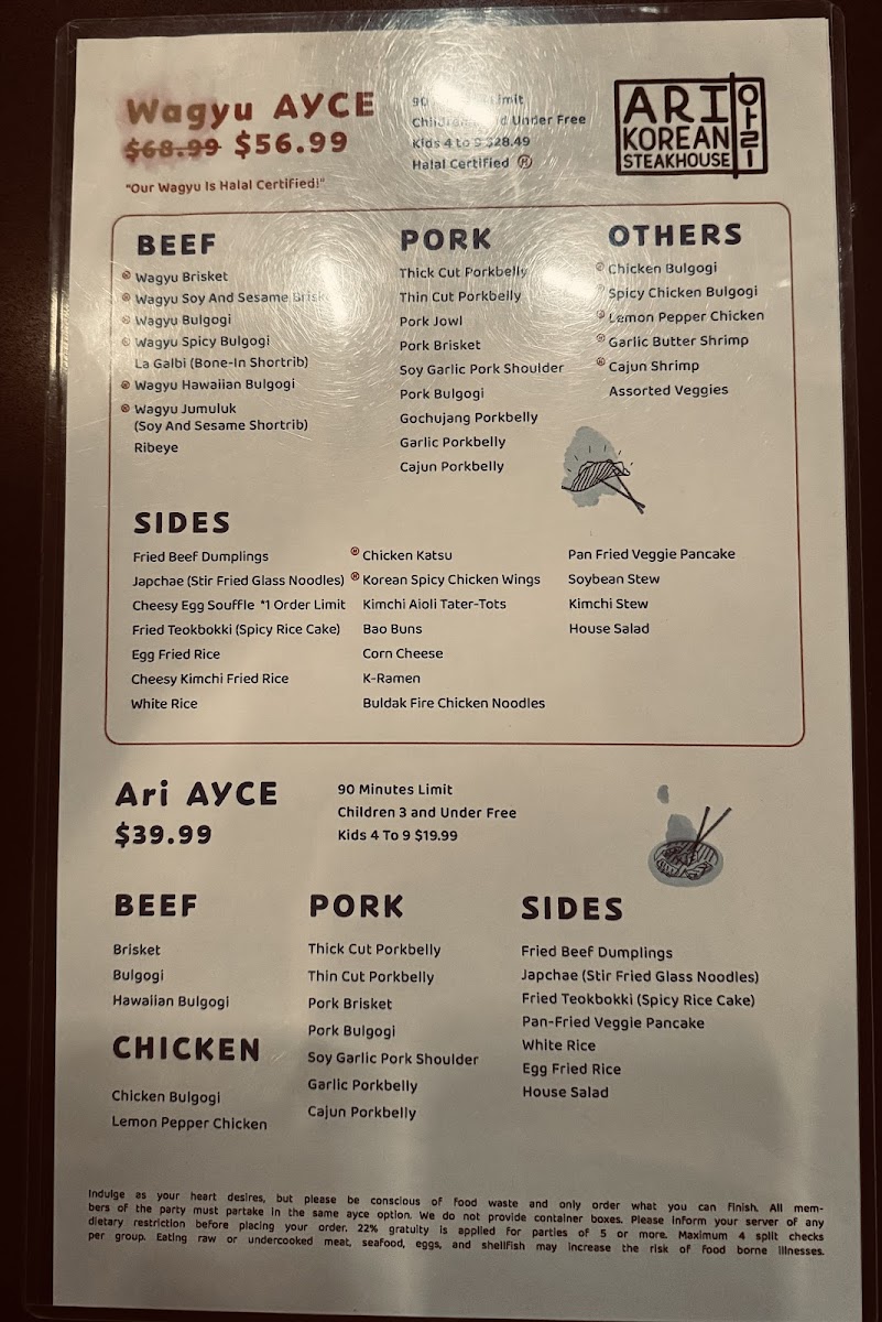 At Ari Korean BBQ & The Cakeshop Menu, you'll experience a delightful blend of authentic Korean BBQ and irresistible cakes, perfect for any occasion. Located in the heart of Johns Creek, Georgia, this spot offers a cozy atmosphere where you can enjoy grilling your own meats right at your table, creating a truly interactive dining experience. Whether you’re in the mood for perfectly seasoned beef, pork, or chicken, the menu delivers a variety of options that cater to all tastes. And don’t forget to leave room for dessert - the Cakeshop features a tempting selection of freshly baked treats that range from decadent cakes to delightful pastries. With a menu that pairs savory and sweet seamlessly, Ari Korean BBQ & The Cakeshop ensures a satisfying meal every time you visit.